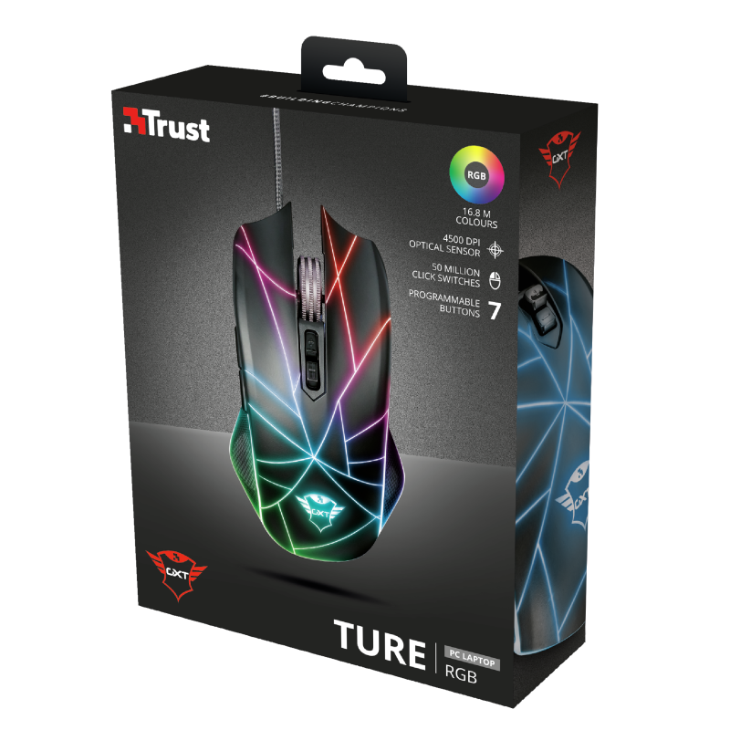 Personaliza el GXT 160X Ture escogiendo uno de los más de 25 modos RGB para aportar tu toque especial. Utiliza el software avanzado de Trust para definir la iluminación, las macros y los botones a fin de conseguir un ratón que sea verdaderamente tuyo. Y gracias al diseño ambidiestro, no importa si se prefiere un ratón gaming para diestros o zurdos. El GXT 160X Ture de Trust se ha hecho pensando en todo el mundo.