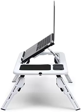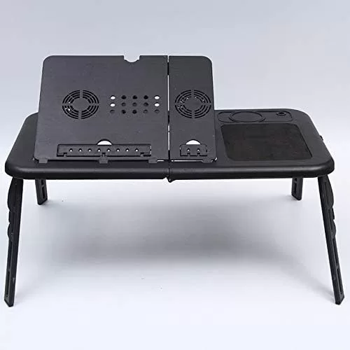– Estructura adecuada para portátiles de cualquier tamaño, patas ajustables a cualquier ángulo cómodo cuando está en uso Descripción: Mesa portátil plegable con 2 ventiladores USB, material plástico ABS con metal dentro de las patas.
